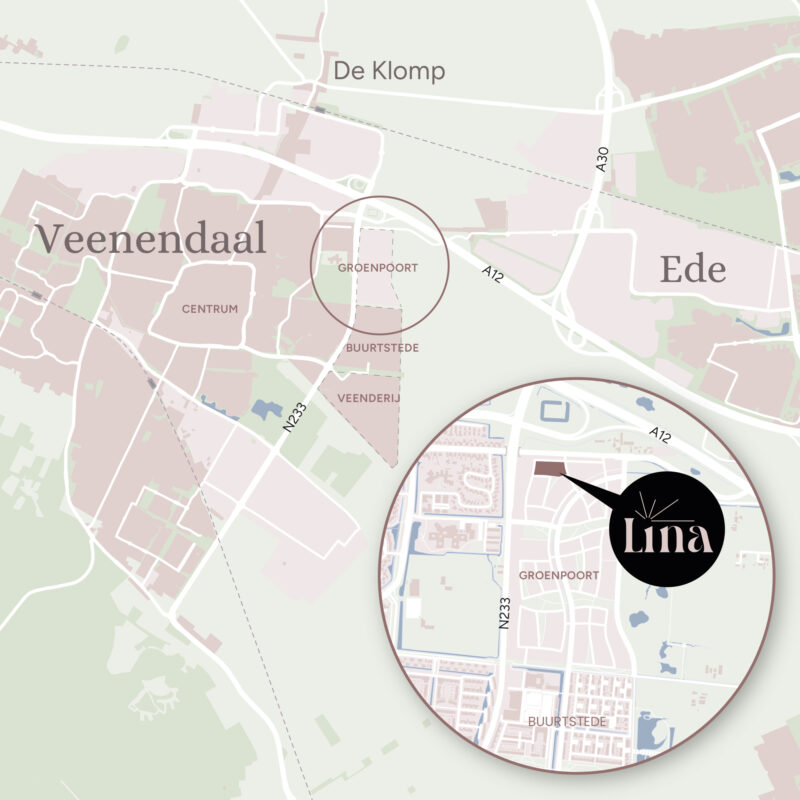Lina vind je in het gezellige buurt De Groenwal, in het noordelijke gedeelte van Groenpoort. En ondanks de rustige, groene omgeving heb je hier alle voorzieningen binnen handbereik. Scholen, winkels en recreatiemogelijkheden liggen op slechts enkele (fiets)minuten afstand. Daarnaast is Veenendaal door de centrale ligging uitstekend bereikbaar met de auto en het openbaar vervoer. Met de A12, A30, A15 en maar liefst drie treinstations in de buurt, ben je overal in een handomdraai. Wat dacht je van een dagje Arnhem, Amsterdam, de Utrechtse Heuvelrug of de Veluwe?